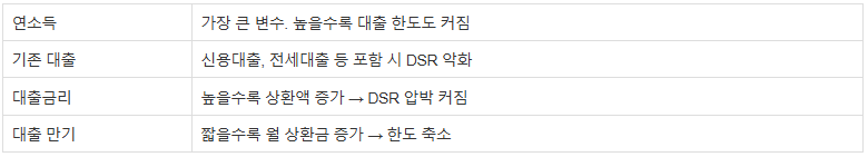 이런 상황에서 대출 한도가 **DSR 40%**로 묶이면, 실질적으로 주담대 가능 금액이 크게 줄어듭니다.